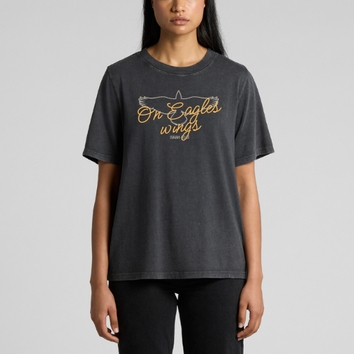 The design features a minimalist line-art eagle in flight, overlaid with “On Eagles Wings” in a flowing, mustard golden script. Set against our dark, stone washed high quality heavy tee. The warm tones of the text, creating a look that is both bold and encouraging.