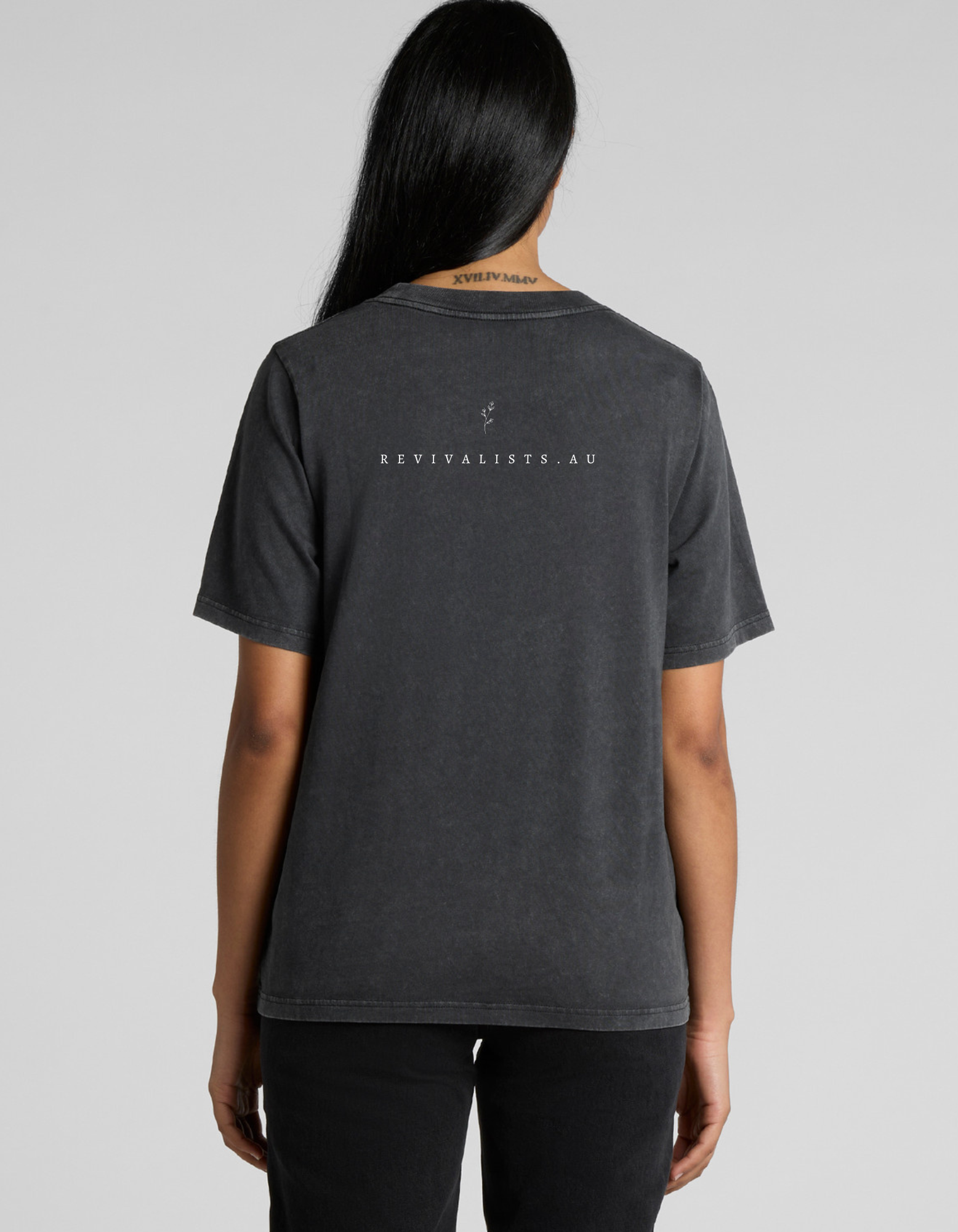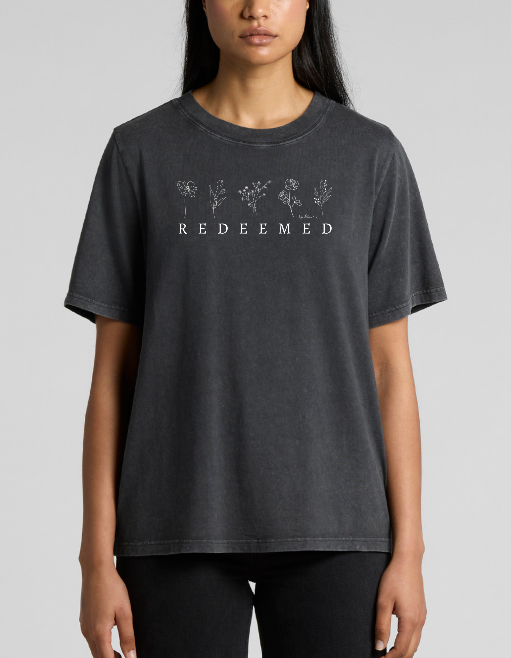 Understated elegance with a powerful message. This stone washed dark charcoal tee features a delicate, white line-art design of five unique wildflowers, resting above the single word: REDEEMED, referencing the promise found in Revelation 5:9. This tee combines a modern botanical aesthetic with a timeless truth. With its vintage feel and clean white lettering, it’s a subtle conversation starter and a daily reminder of your identity in Christ.